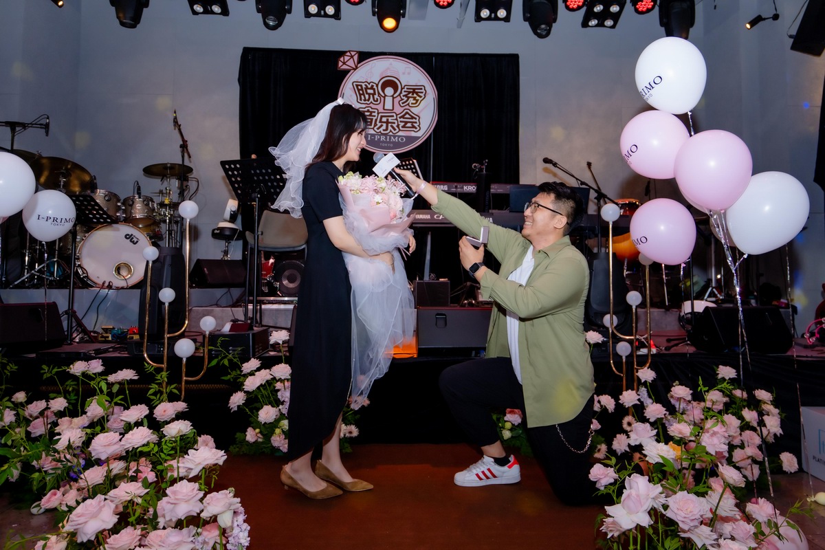 脫口秀和音樂Live的燃情氣氛醞釀著一個甜蜜時刻。I-PRIMO從真實已購顧客中秘密邀請了一對神秘情侶,與男主角共同籌劃了一場笑點與淚點并存的求婚儀式,那枚閃耀著幸福光輝的鉑金鉆戒,也將為他們就此開啟一段全新的甜蜜旅程。