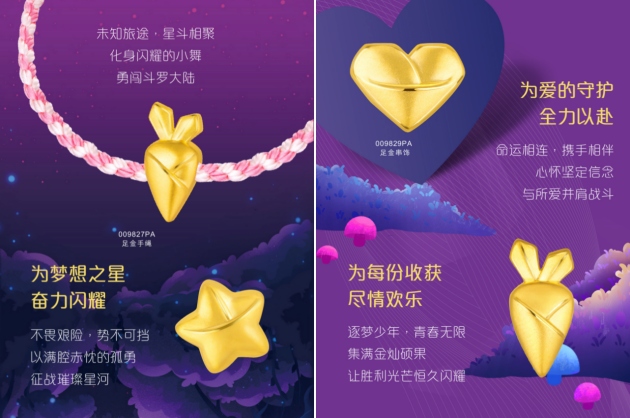 次元作為一種非大眾廣泛涉及的興趣圈層,想要觸達Z世代的心智,并非易事,但六福珠寶有攻破壁壘的巧妙辦法,產品顏值是決定消費者是否發生購買行為的關鍵要素,寶寶舞和兔子的治愈形象,已經刷新了一波《斗羅大陸》動畫及更多動畫迷的眼球,內含的足金產品也大大地提升了聯動套裝的吸引力和“含金量”,在黃金首飾持續走熱的大前提下,瞄準時下年輕人“存第一桶金”“攢金豆”的偏好,把聯名禮盒打造成透明粉“存金罐”,將配套的星星、心形、胡蘿卜金粒珍藏入罐,其背后分別代表夢想、愛情與收成,伴隨金粒迭加,帶來日“富”一日的樂趣,相較于要花大價錢購入的黃金首飾,顯然這個實現黃金自由的攢金方式要輕松許多。除此之外,在首飾上發掘多種方式佩戴也是年輕人偏好之一,不同形狀的金粒可以解鎖佩戴屬性進行混搭,輕松實現一周搭配不重樣。